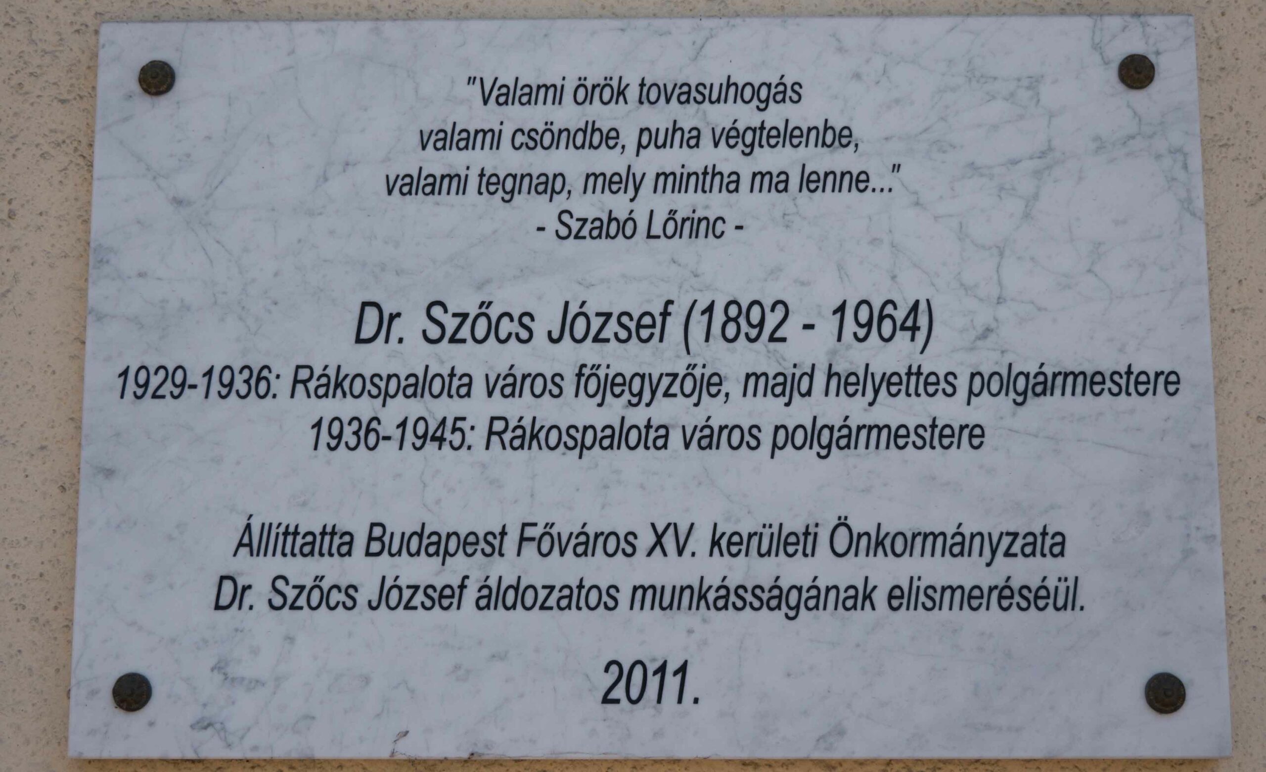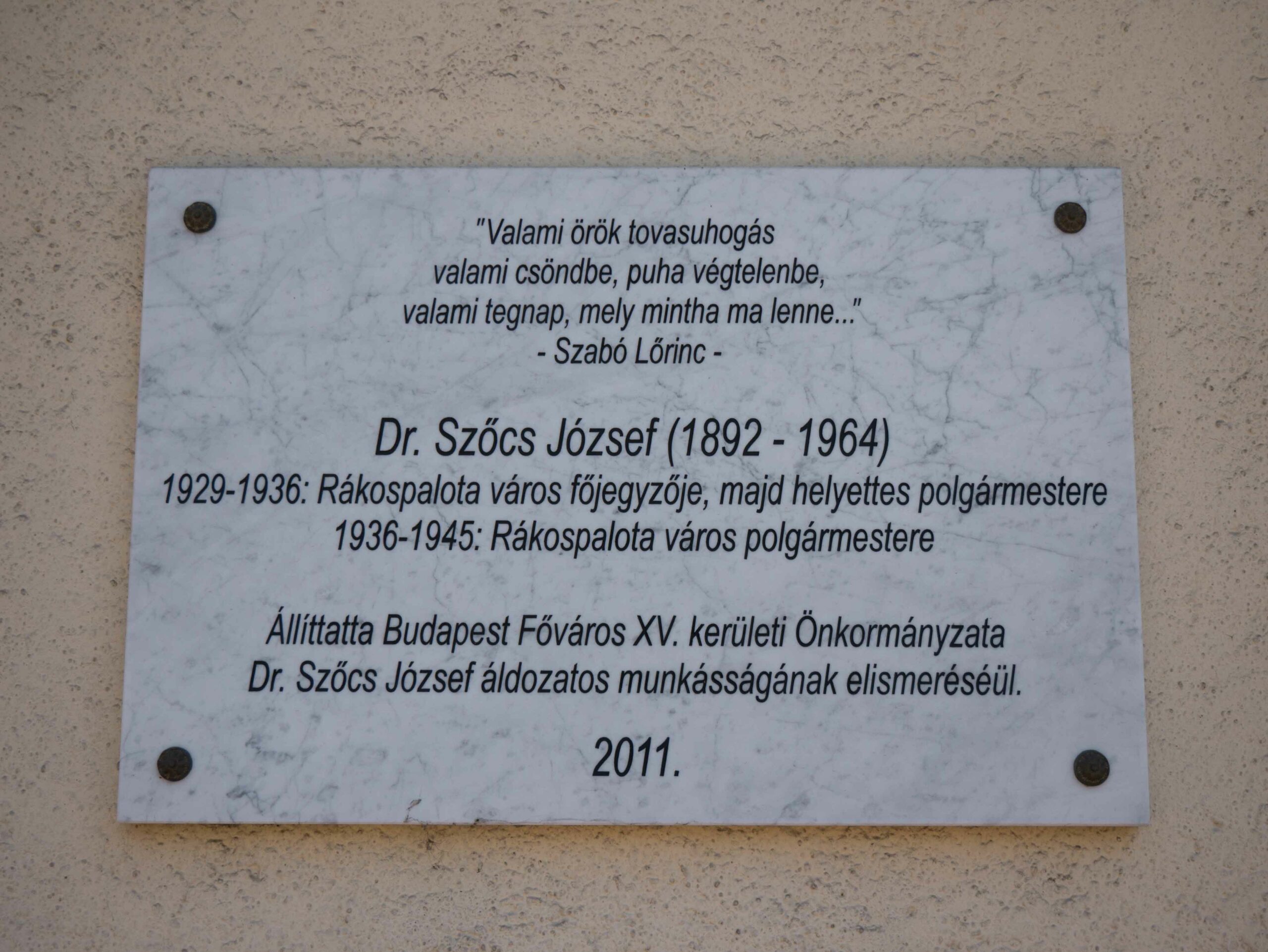 Az emléktáblát a 15. kerületi Önkormányzat állíttatta Dr. Szőcs József áldozatos munkásságának elismeréséül 2011-ben.