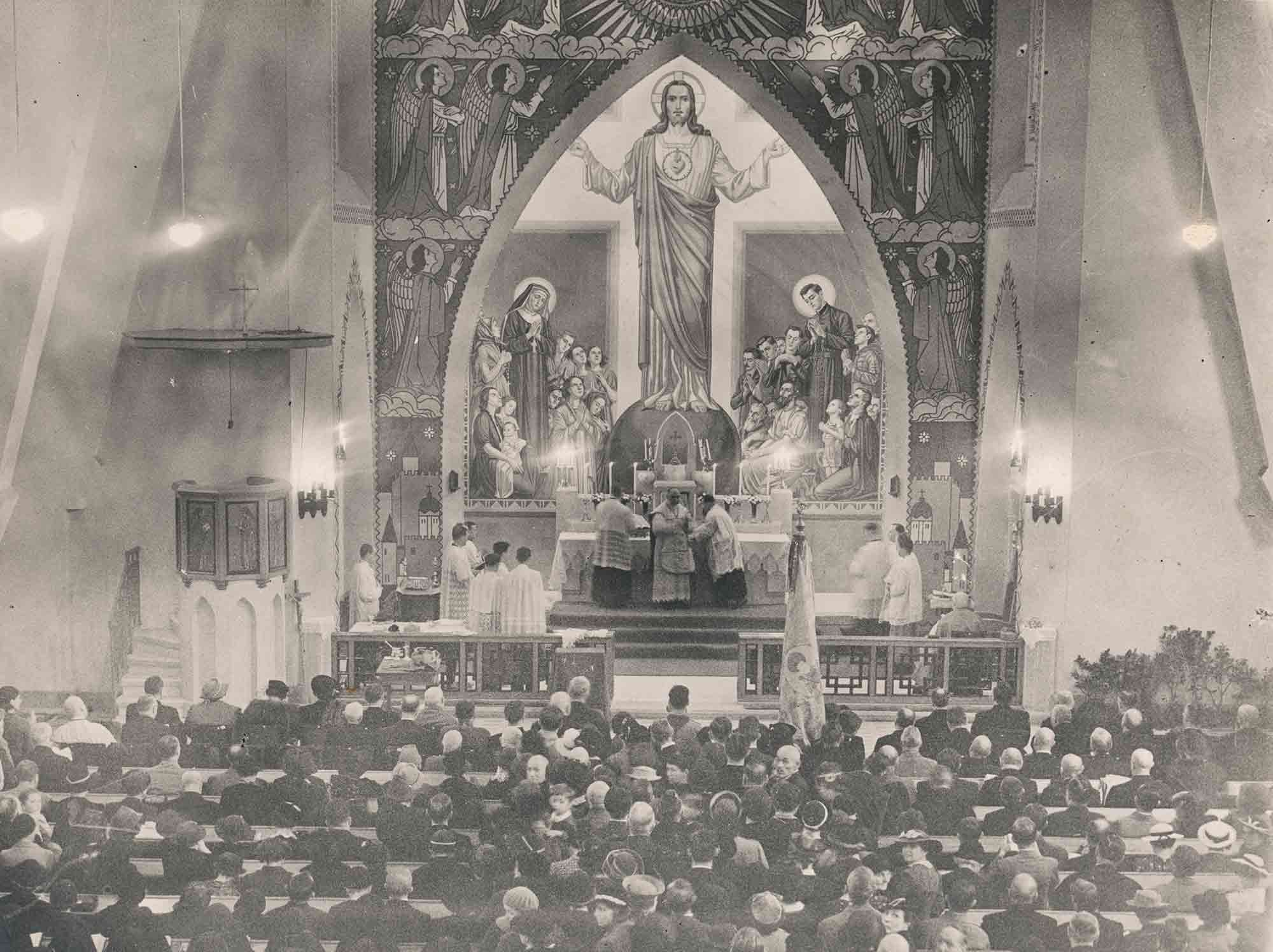 „A templomot eredetileg a szaléziek közreműködésével Don Bosconak akarták ajánlani, ám végül a Jézus Szíve irányzat felé fordultak a templomépítők. Jézus szívének a tisztelete két, a XVII. században élt szentnek köszönhetően terjedt el, Alacoque Szent Margit és Colombiére Szent Kolos révén, akik a templomi oltárfreskón kiemelkedve szerepelnek. A Szent Szív kultusz elterjedése érdekében egyébként a jezsuiták fejtettek ki erőfeszítéseket, s a XIX. század közepére lett elfogadott az egyházon belül. Magyarországon a XIX. század végétől terjedt el a kultusz, az első Jézus Szíve oltárt a tihanyi apátságban állították fel, majd a XX. században, különösen az 1930-as években lett sok Jézus Szíve templom – ebben az időszakban épült a MÁV-telepi is.” (Rátonyi, 2013).