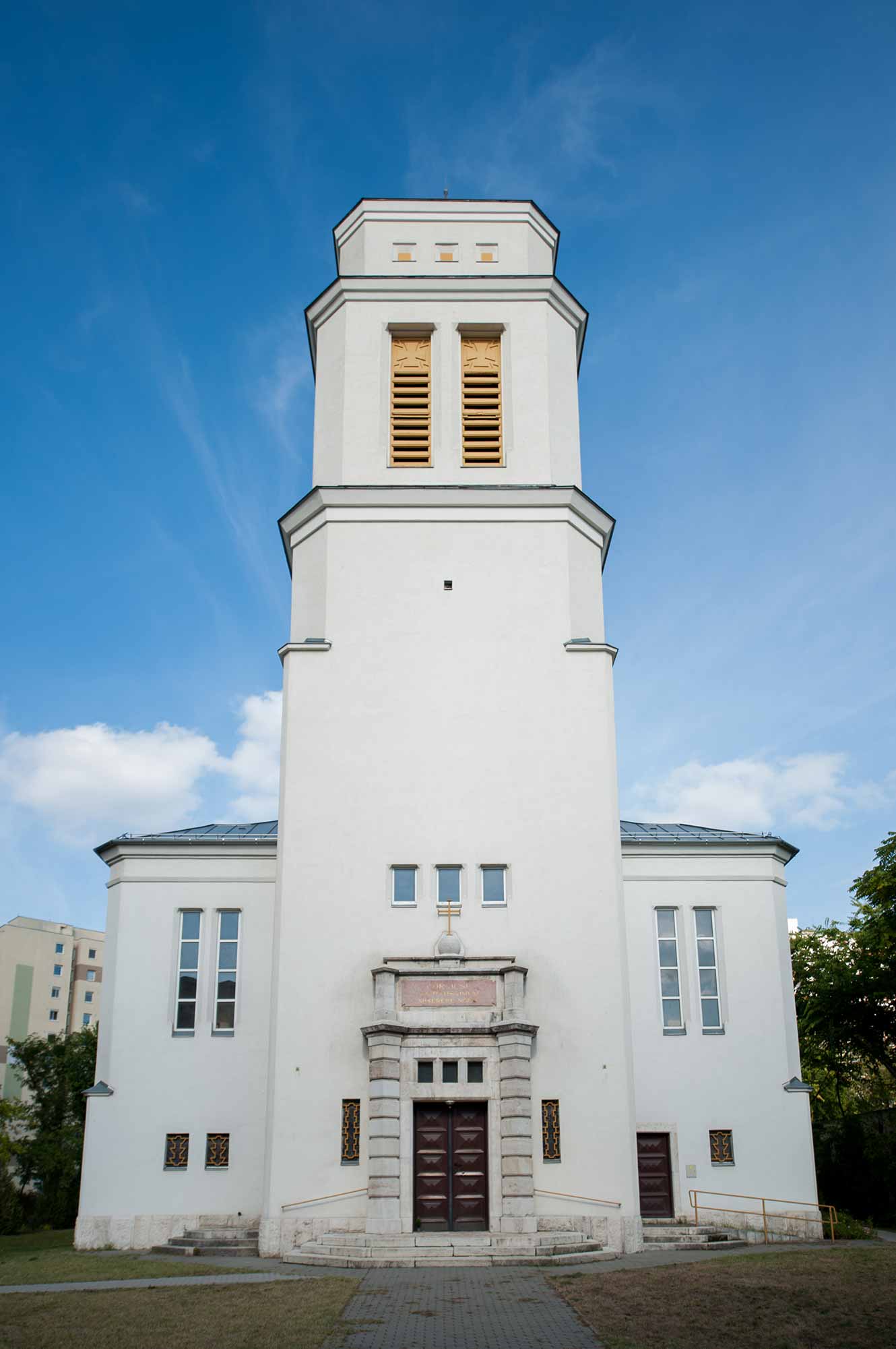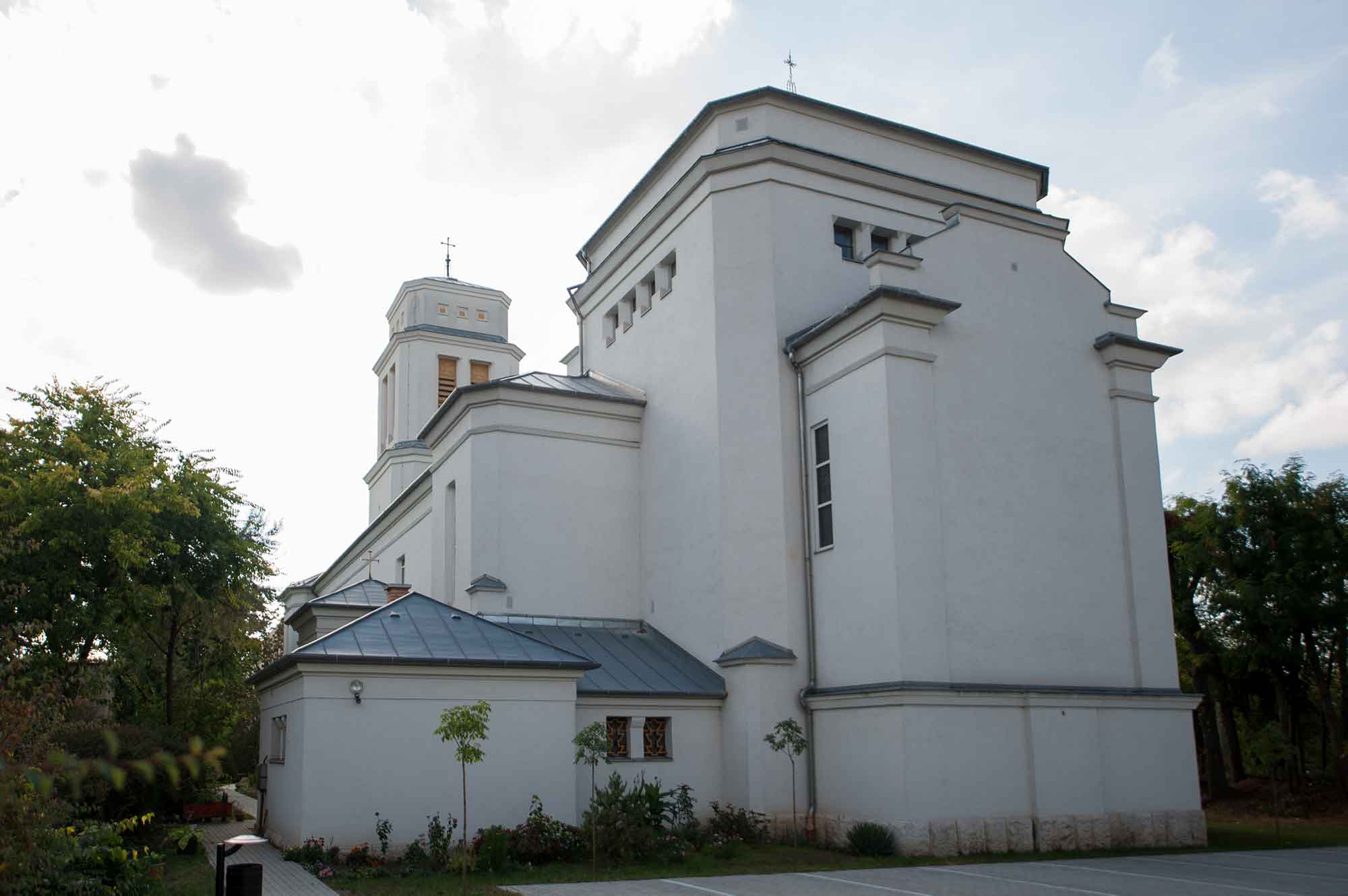 A templomépületet Heintz Béla műépítész tervezte, aki a római iskolát ötvözte a korszak modern felfogásával. A kivitelezést egy rákospalotai építőmester, Fülöp József végezte, majd az oltár és freskóképeket pedig a szintén a római iskolához tartozó Leszkovszky György festőművész készítette. A színes üvegablakokat, melyeket Kölber Ernő tervezett, Majoros Károly cége készítette el, ezek azonba a II. világháború alatt szinte mind megsemmisültek, így ezeket a későbbiekben az eredeti tervek alapján több ízben is pótolni kellett (Rátonyi, 2013).