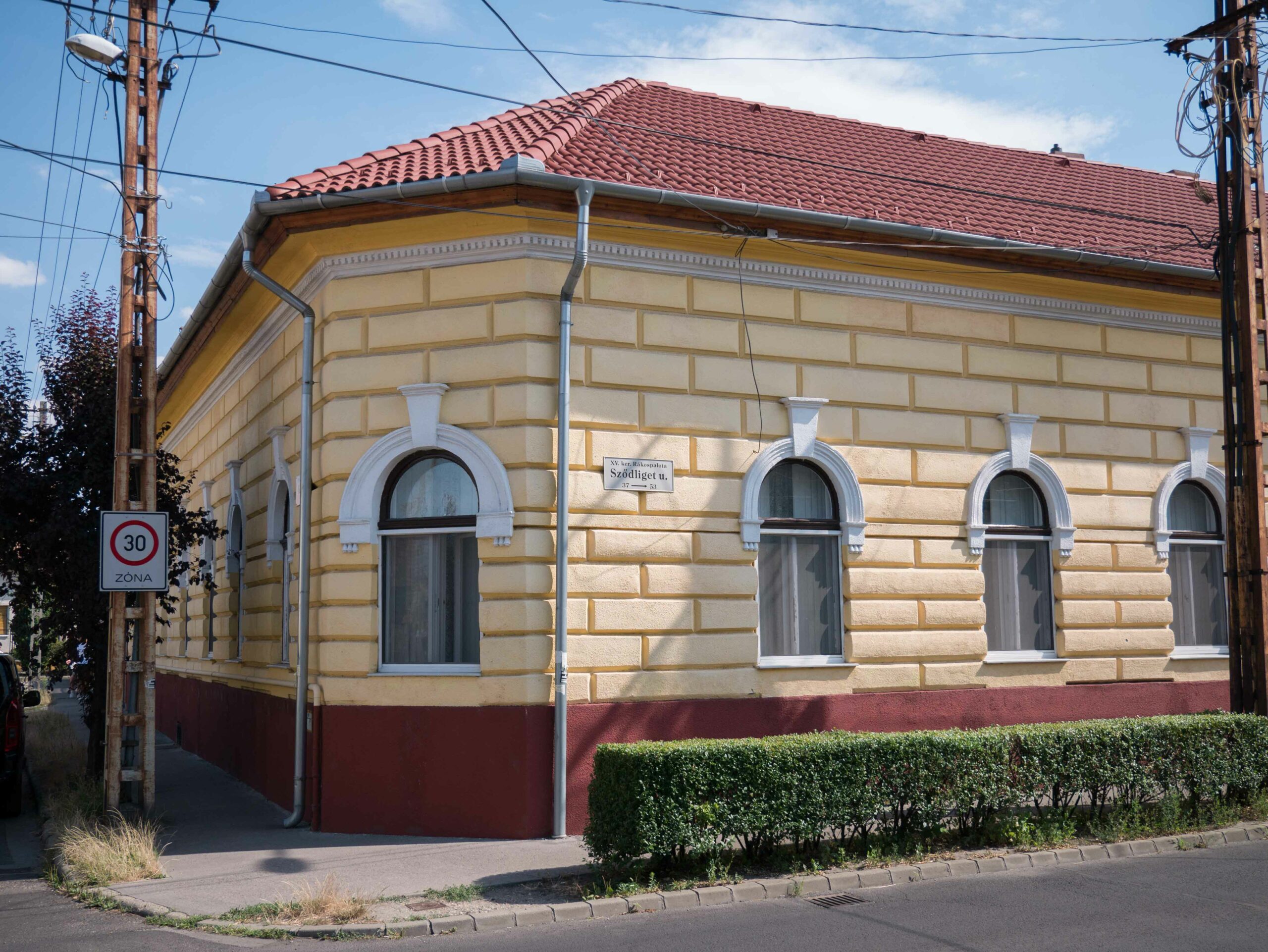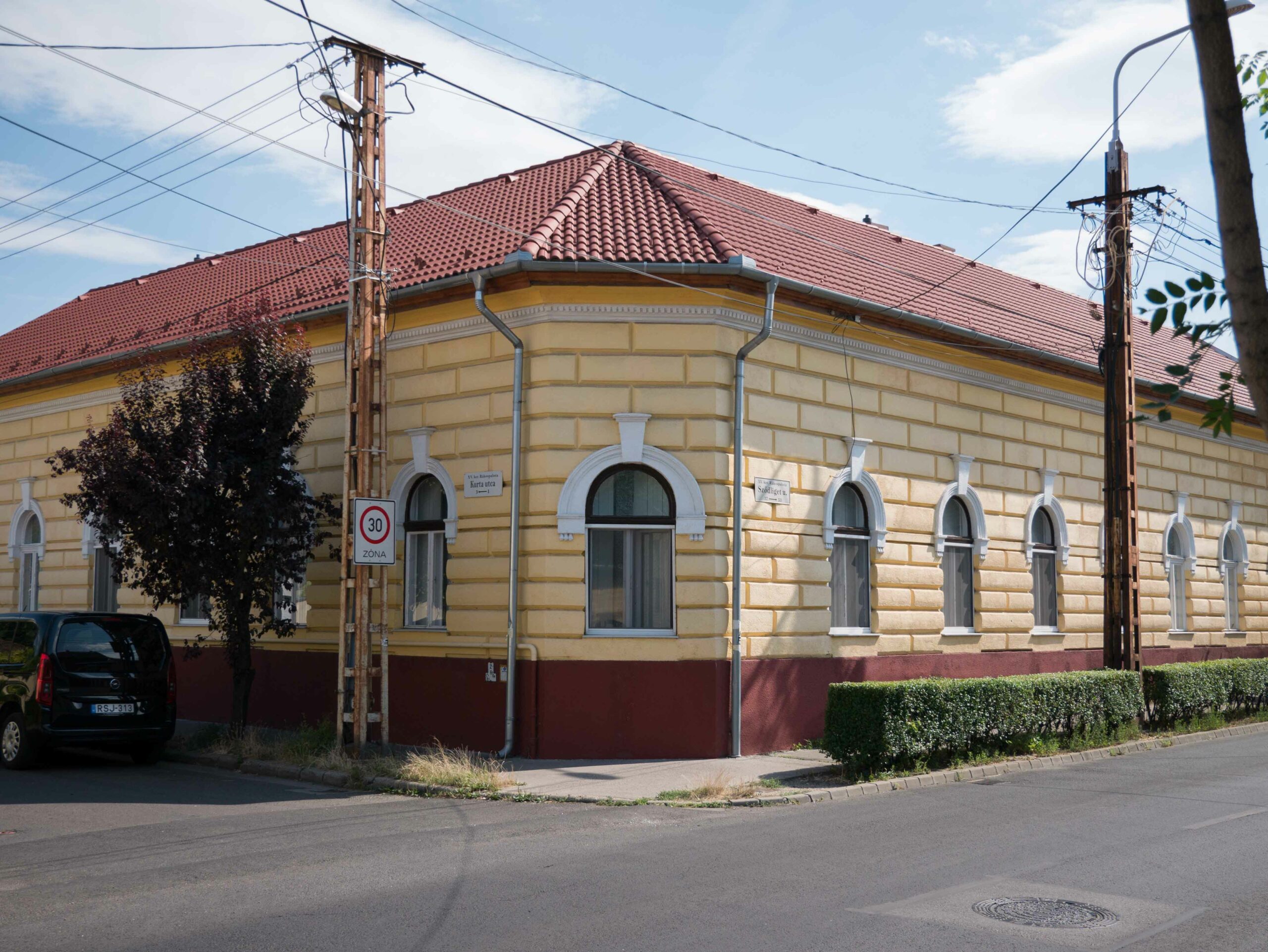 „Sződliget utca felé zártsorúan, Kurta utca felé hézagosan zártsorúan épült, 6 / 1 / 9 tengelyes, levágott sarkú tekintélyes magasföldszintes kisvárosias jellegű sarokház íves záródású ablakokkal, teljes homlokzati felületen rusztikus kváderezéssel.” (Perczel, 2010)