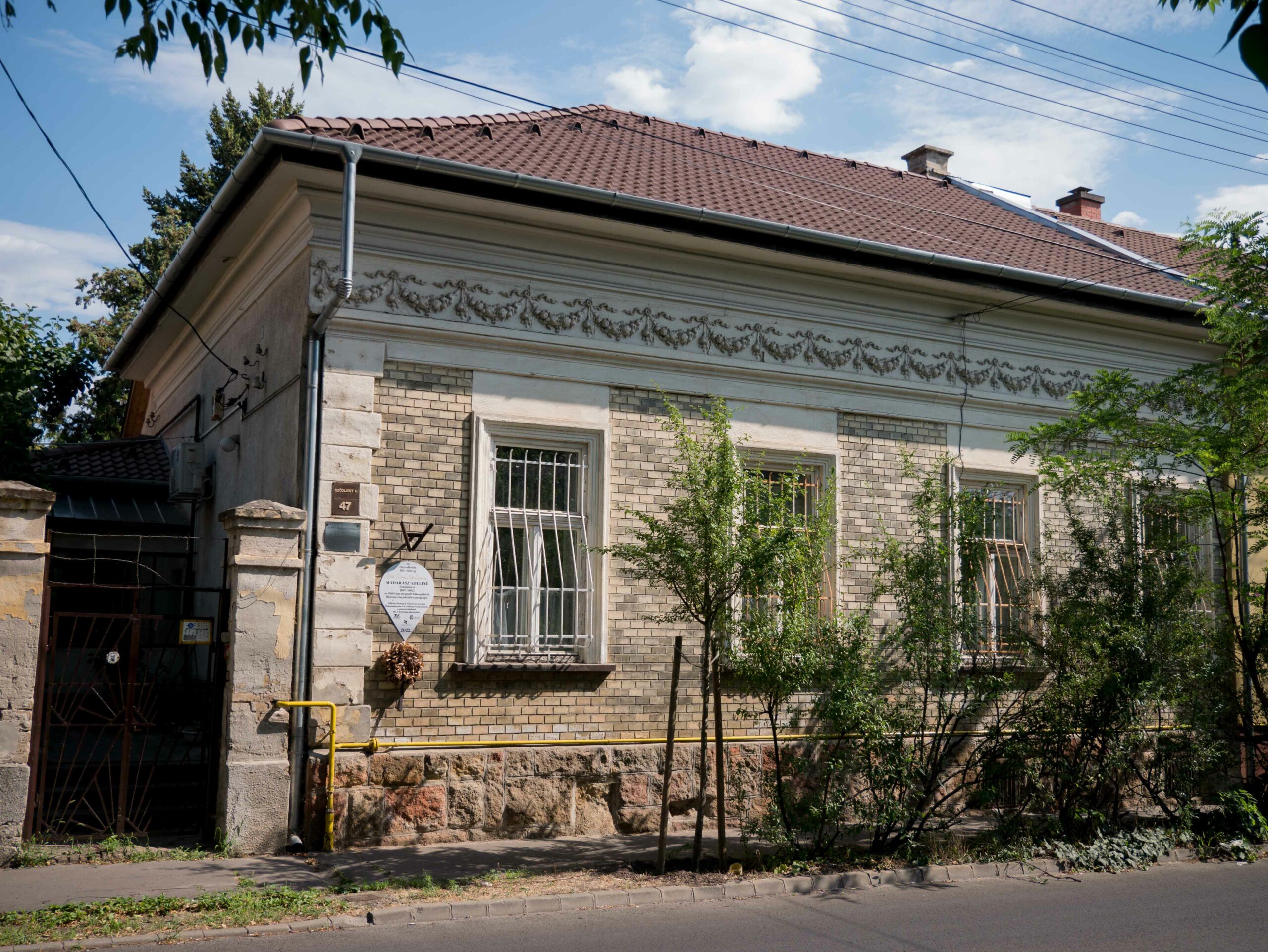 „Hézagosan zártsorúan utcával párhuzamosan épült, igen hosszú, 8 tengelyes, téglaburkolatú, kisvárosias lakóépület, húzott és füzérekkel is díszített párkánnyal, szabad oldalán tetőkontyolással, világos téglaburkolattal, rusztikus kőlábazattal, eredeti kerítéssel, kerti kapuzattal.” (Perczel, 2010)