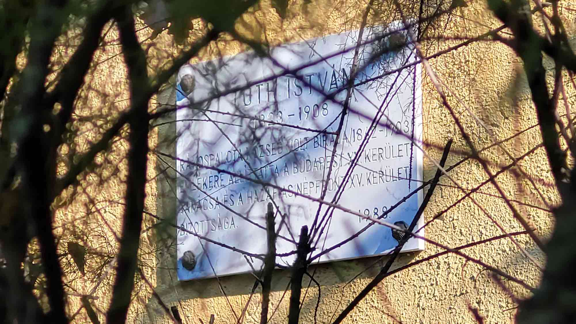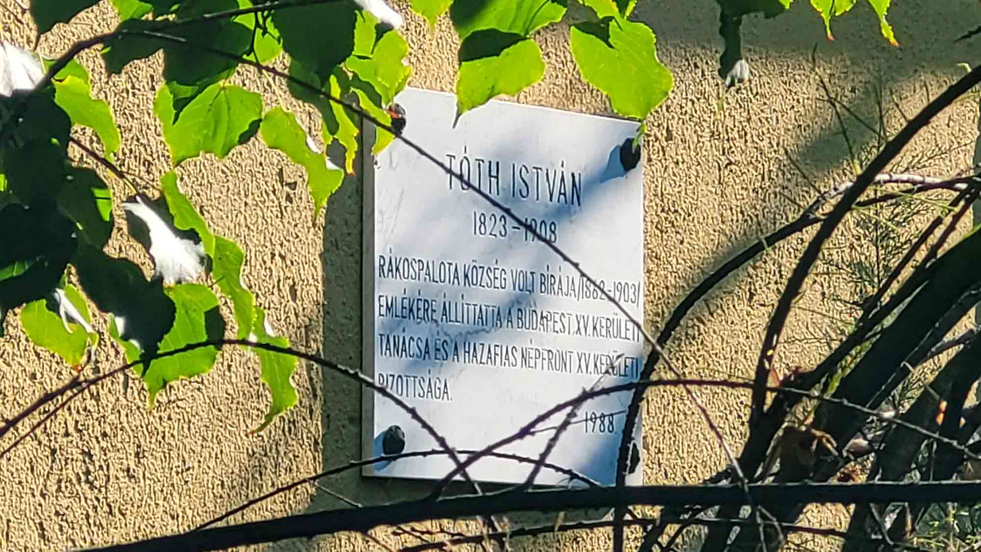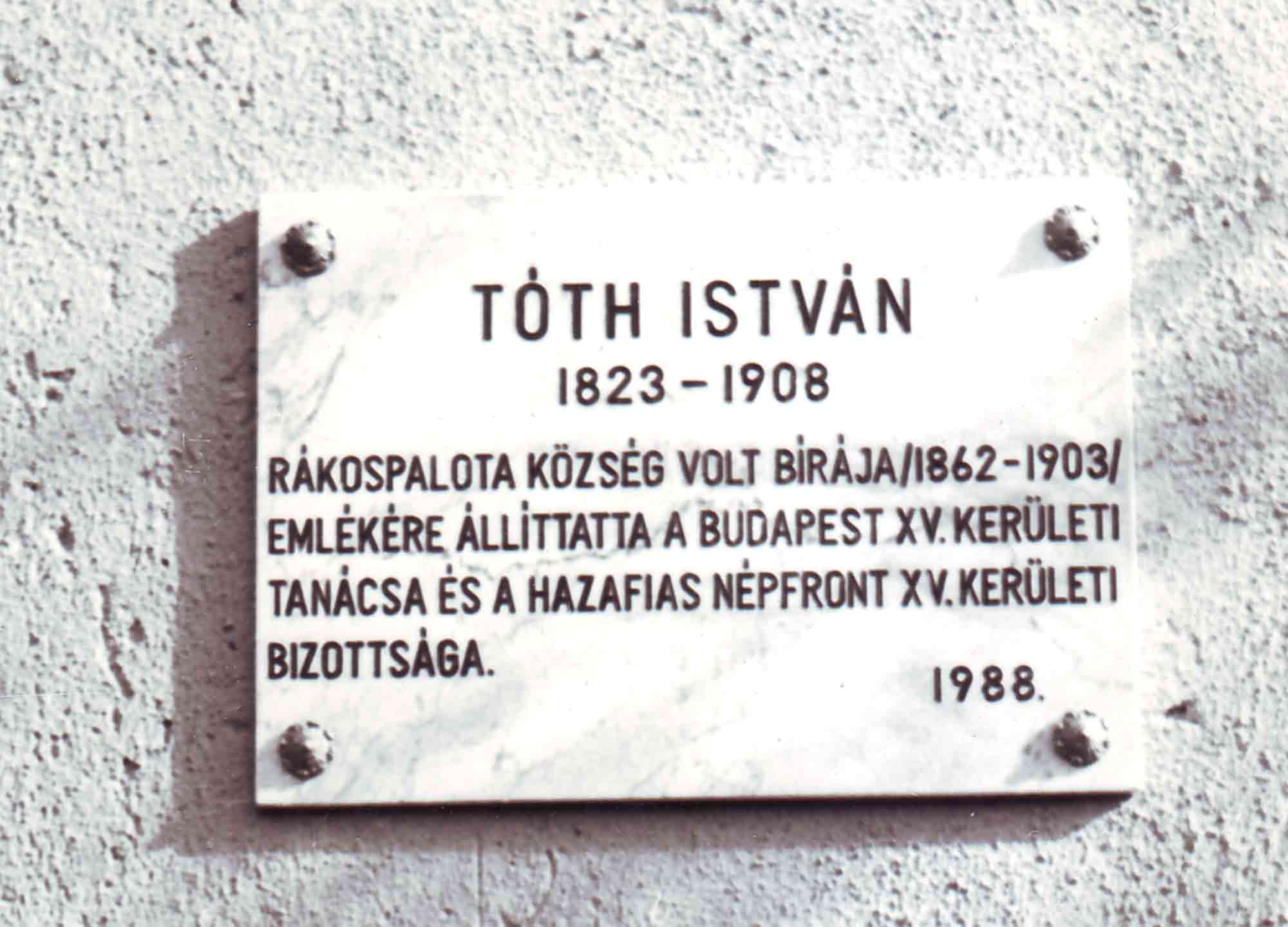 A rajta olvasható szöveg: „Tóth István (1823-1908). Rákospalota község volt bírája /1862-1903/ emlékére állíttatta a Budapest XV. Kerületi Tanácsa és a Hazafias Népfront XV. Kerületi Bizottsága. 1988.”