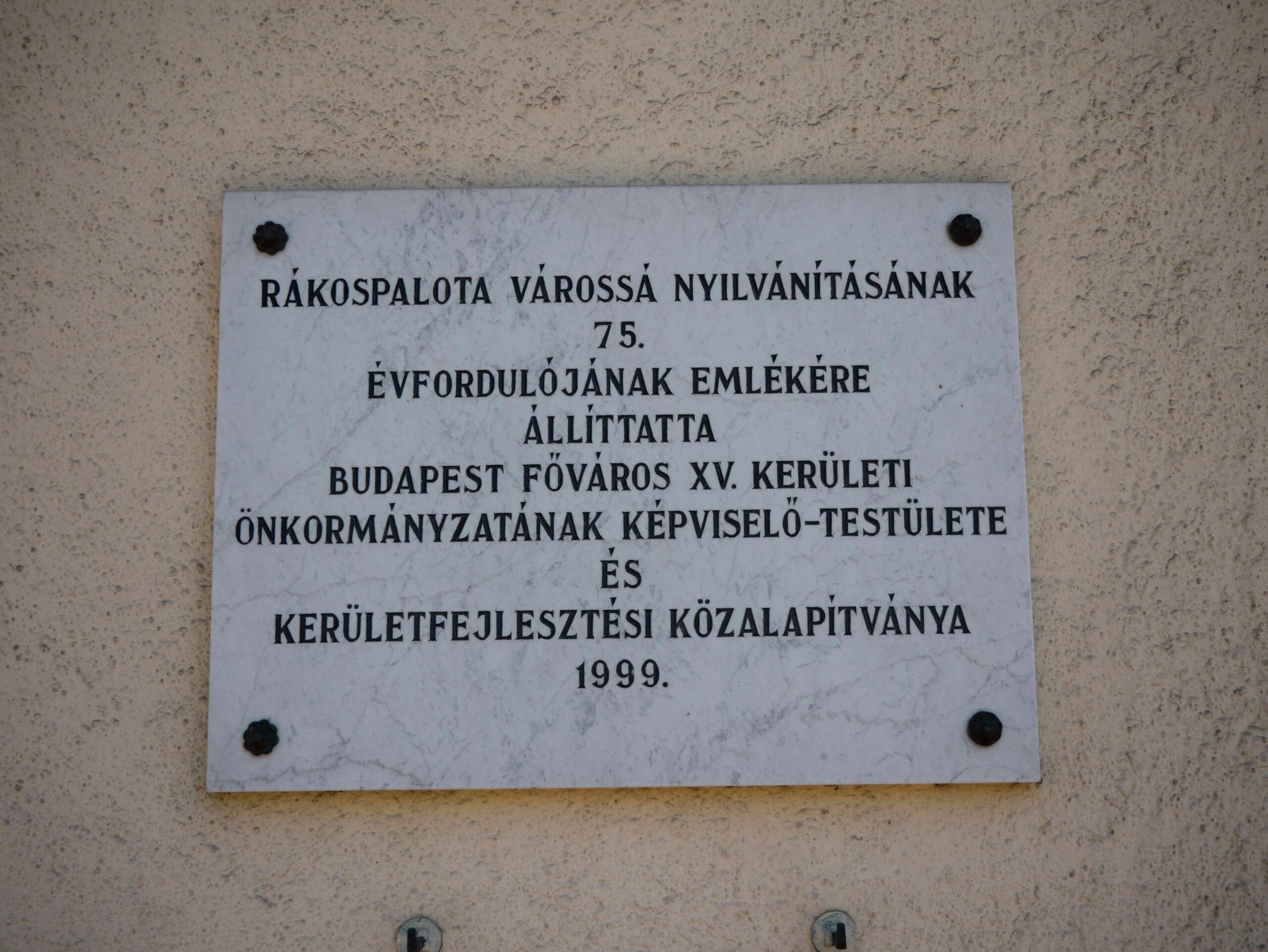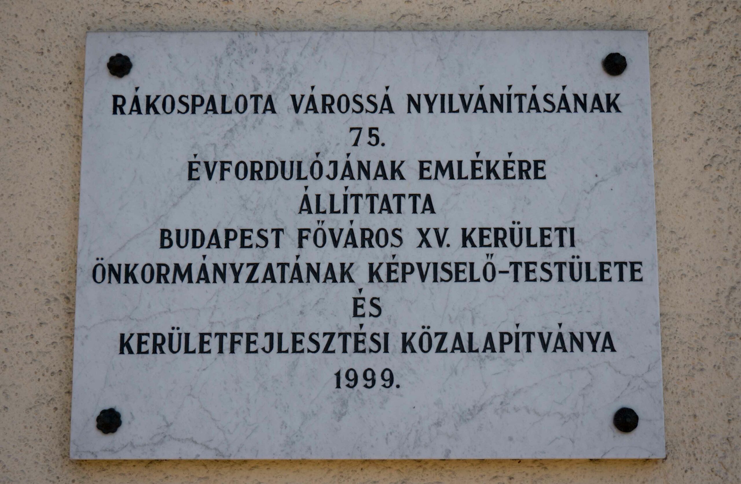 Az emléktáblán ez olvasható: „Az emléktáblát Rákospalota várossá nyilvánításának 75. évfordulójának emlékére állíttatta Budapest főváros XV. kerületi önkormányzatának képviselő-testülete és kerületfejlesztési közalapítványa 1999.”