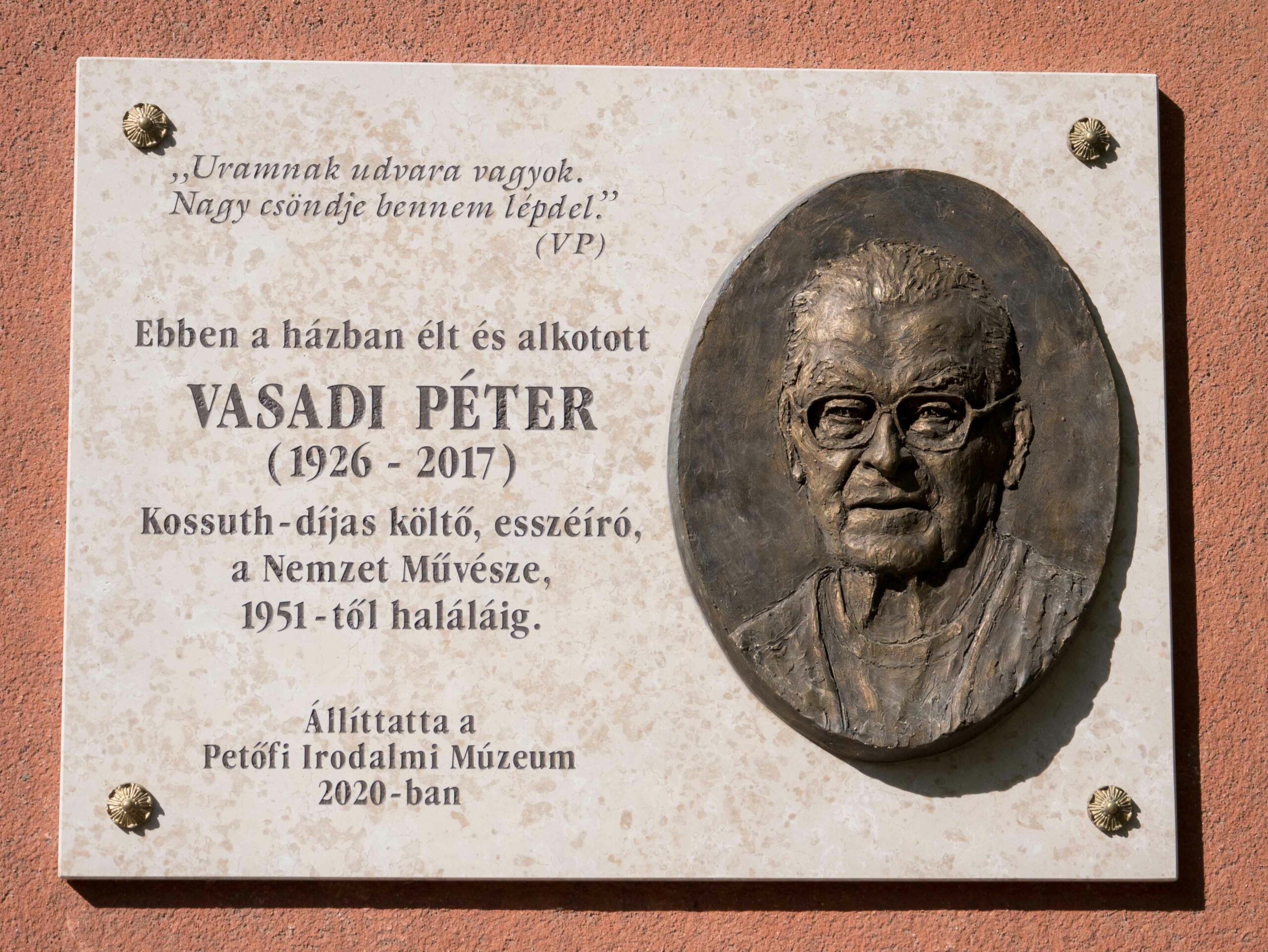 Az emléktáblán a következő felirat olvasható: „»Uramnak udvara vagyok. / Nagy csöndje bennem lépdel.« / (VP) / Ebben a házban élt és alkotott / Vasadi Péter / (1926-2017) / Kossuth-díjas költő, esszéíró / a Nemzet Művésze, / 1951-től haláláig. / Állíttatta a / Petőfi Irodalmi Múzeum / 2020-ban.”